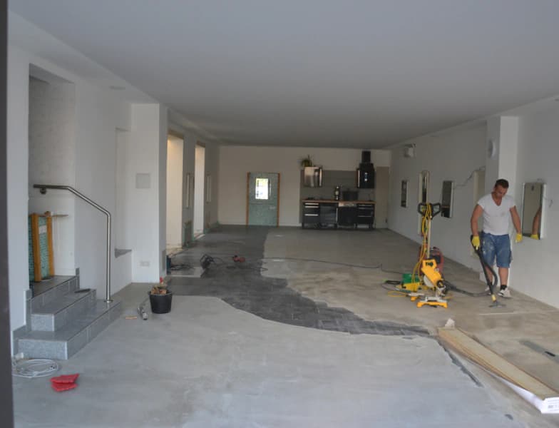 Im Haarstudio Bergmann in Ketsch haben wir den Boden aufgefrischt und ihm neuen Glanz verliehen. Zunächst wurde eine Spachtelmasse auf den vorhandenen Fliesenboden aufgetragen, um eine ebene Oberfläche für den neuen 3-Schicht-Parkettboden aus Eiche natur roh zu schaffen. Dieser wurde sorgfältig verlegt und anschließend mit einem hochwertigen Naturöl in Nussbaum behandelt, um seine natürliche Schönheit zu betonen.