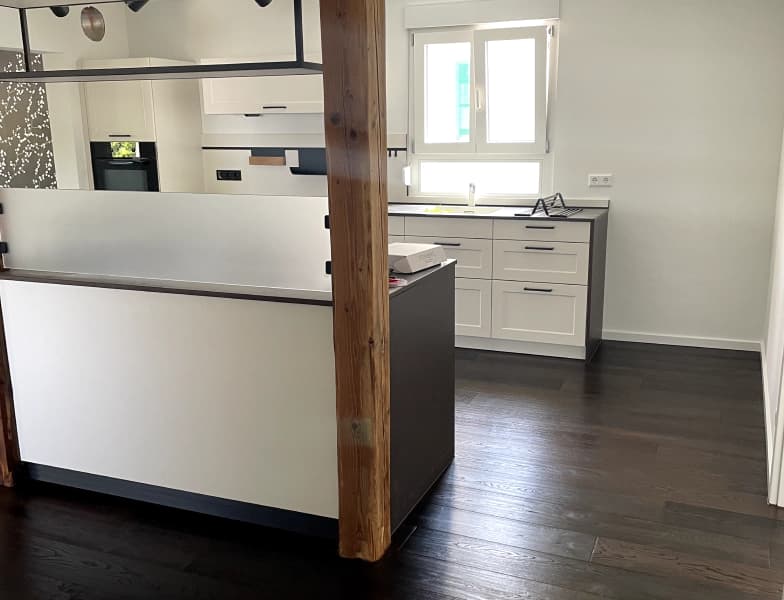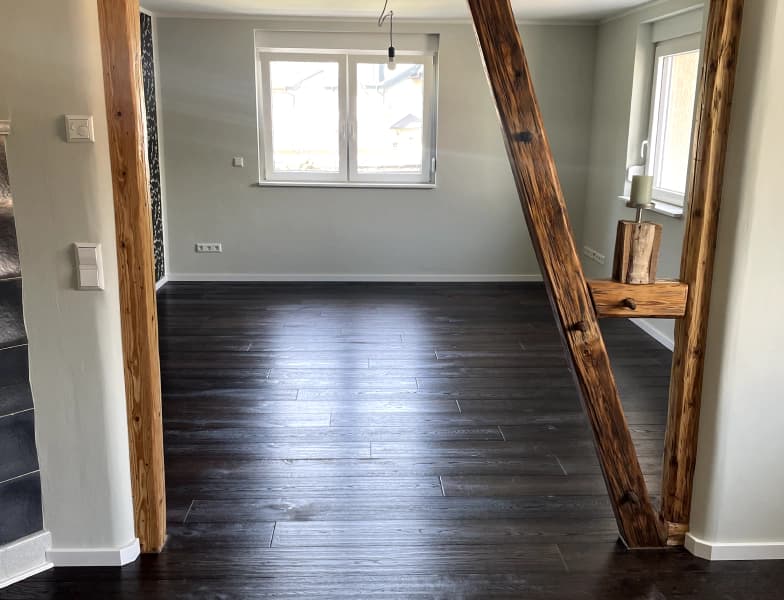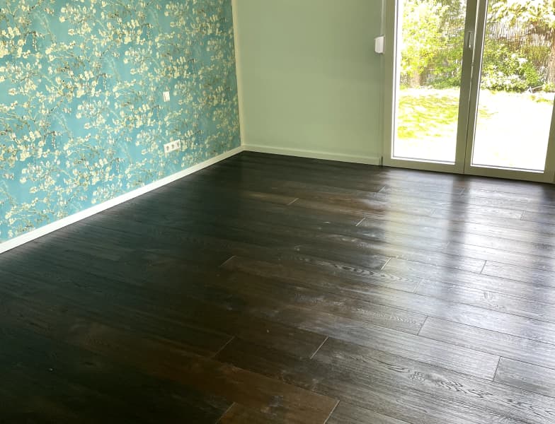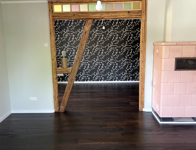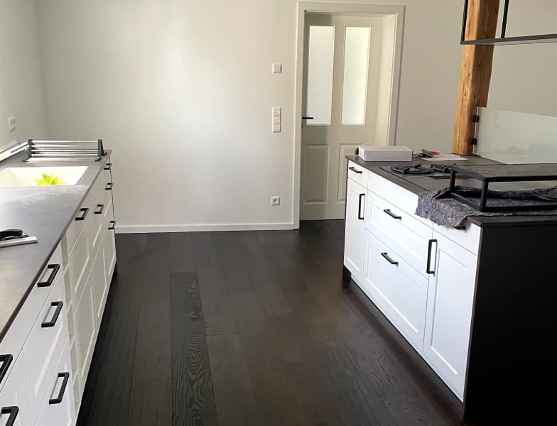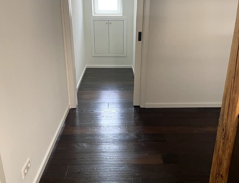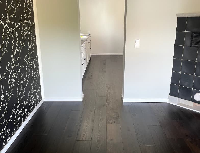 Bei diesem Projekt wurden Risse im alten Estrich verharzt und Fehlstellen aufgefüllt. Unterschiedliche Höhen wurden angeglichen und die gesamte Fläche nivelliert. Anschließend verlegten wir handgehobelte und geölte 3-Schicht Räuchereiche. Passend zu den Türen montierten wir weiße Leisten. Eine Besonderheit war die Verlegung des Parketts bis ins Badezimmer, einschließlich Badewanne und Waschtischgestell, die ebenfalls aus demselben Parkett gefertigt wurden.