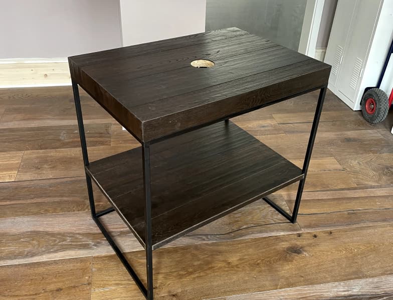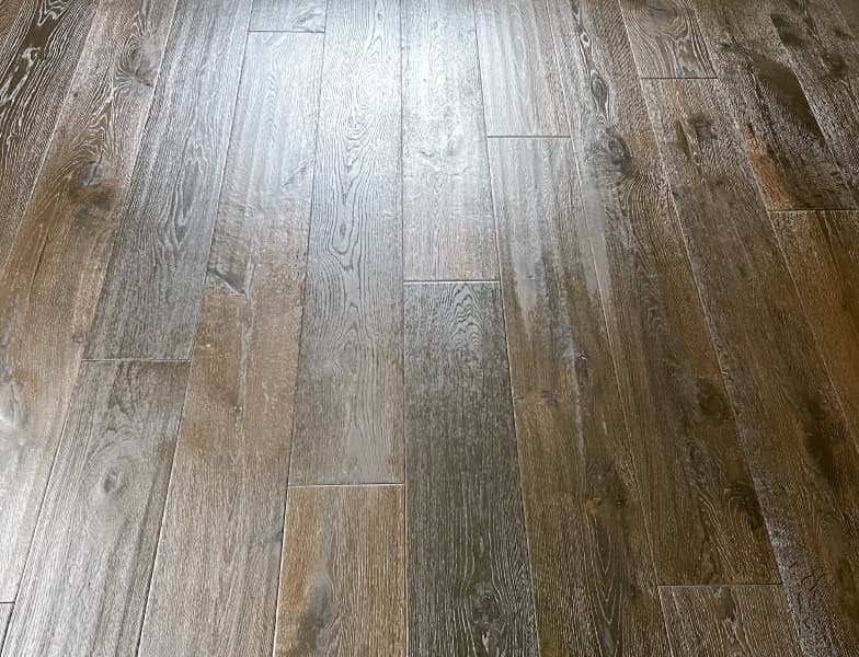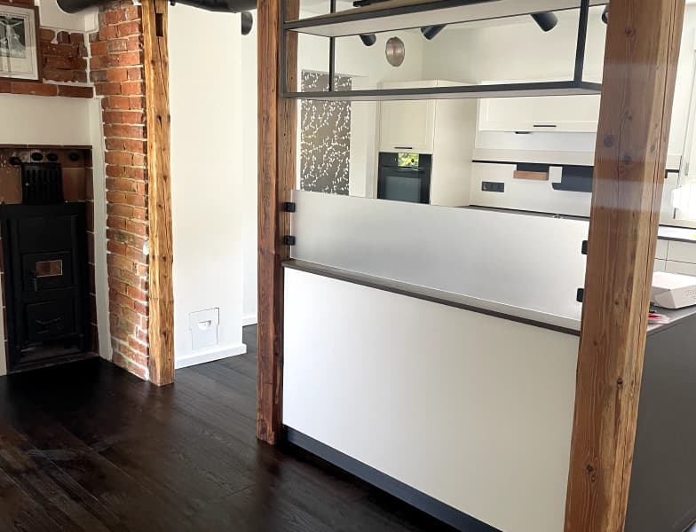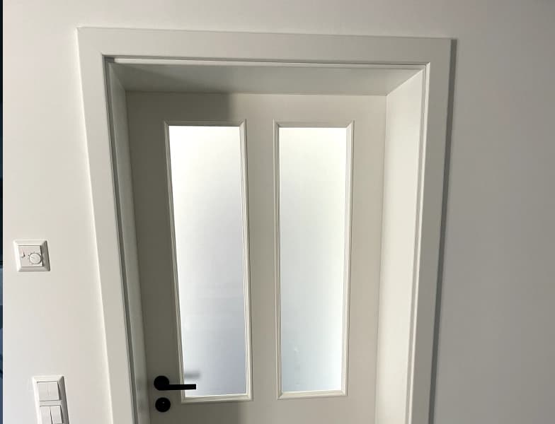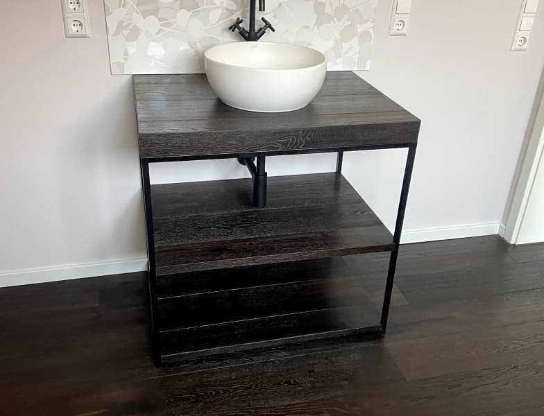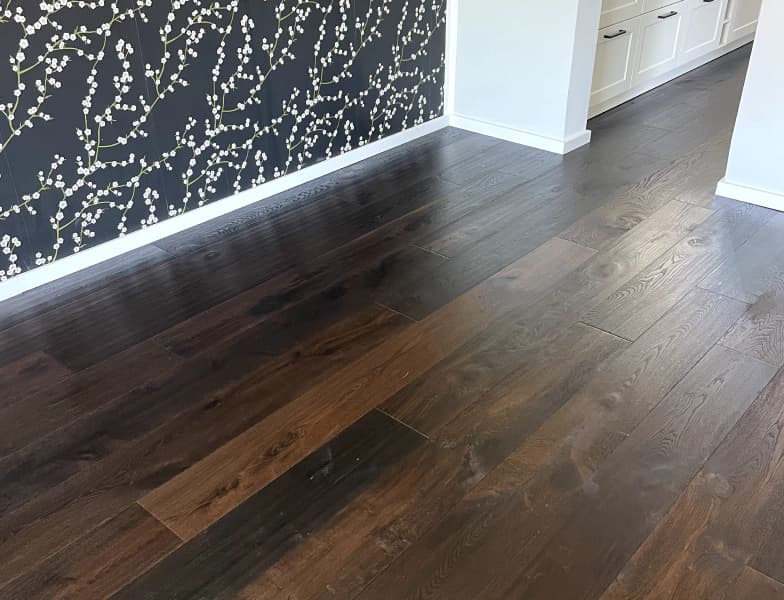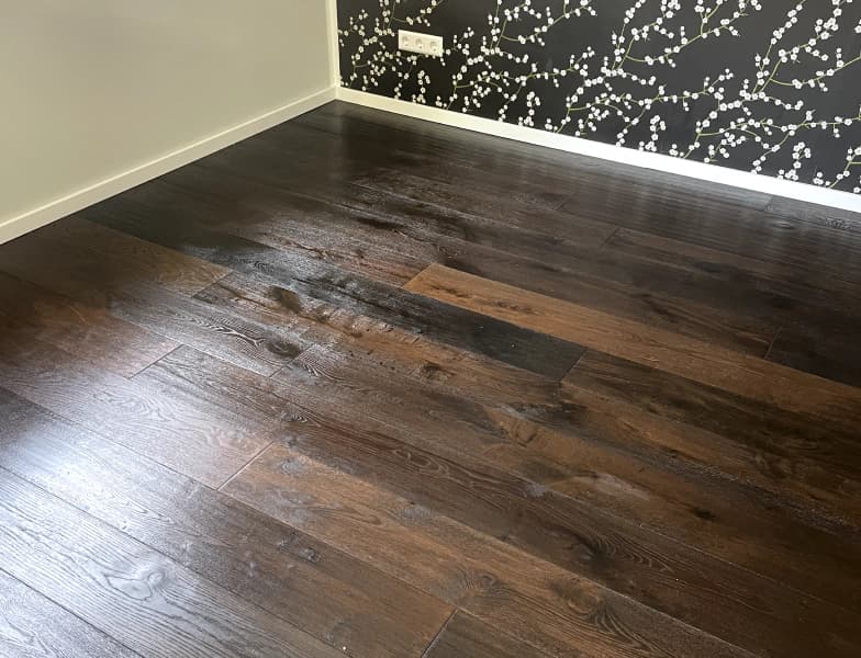 Bei diesem Projekt wurden Risse im alten Estrich verharzt und Fehlstellen aufgefüllt. Unterschiedliche Höhen wurden angeglichen und die gesamte Fläche nivelliert. Anschließend verlegten wir handgehobelte und geölte 3-Schicht Räuchereiche. Passend zu den Türen montierten wir weiße Leisten. Eine Besonderheit war die Verlegung des Parketts bis ins Badezimmer, einschließlich Badewanne und Waschtischgestell, die ebenfalls aus demselben Parkett gefertigt wurden.