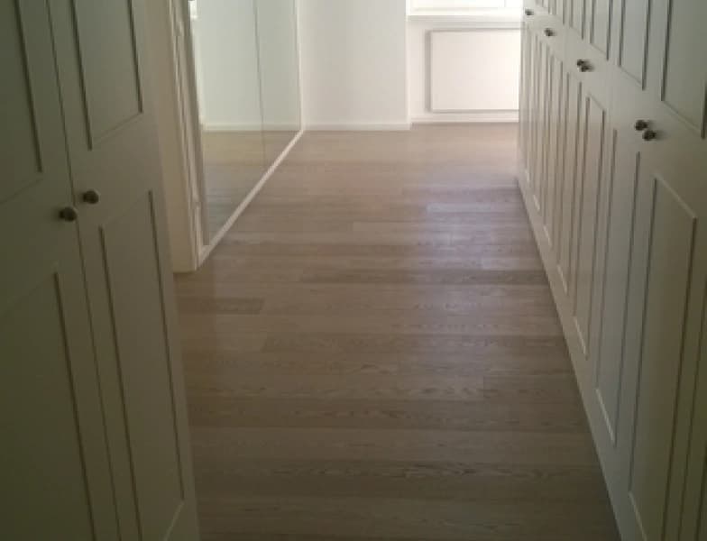 Die Besonderheit dieses Projekts lag in der diagonalen Bauform des Hauses, die eine individuelle Gestaltung erforderte. In jedem Stock wurde eine diagonale Diele als optische Trennung verlegt, was eine harmonische Raumgestaltung ermöglichte. Trotz der Herausforderungen haben wir erfolgreich mit sechs Handwerksfirmen zusammengearbeitet, um dieses Projekt termingerecht und mit höchster Präzision abzuschließen.